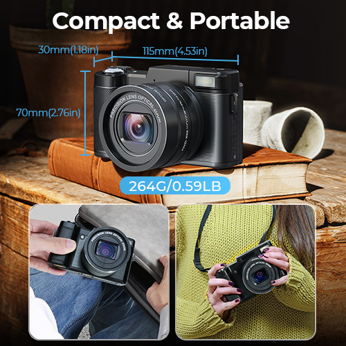 Mindre enn en vanlig smarttelefon, passer denne digitale kameraet for nybegynnere behagelig i én hånd. Den kommer med et halsbånd for å frigjøre hendene dine. Med 2 inkluderte oppladbare batterier vil du alltid ha en reserve, noe som sikrer at du aldri går glipp av et øyeblikk på grunn av strømbegrensninger. Perfekt for utendørs reiser, camping eller fotturer.