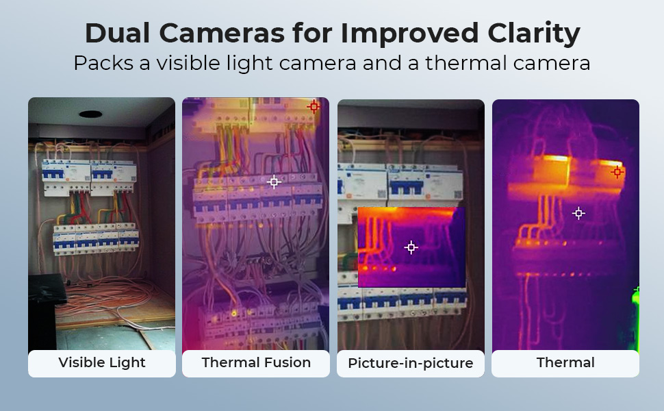 Vår termiske kamera til mobil, spesielt et synlig lyskamera med 640x480 piksler, som gir synlig lyssyn, termisk utsikt, fusjonsutsikt (overskudd av termisk og synlige bilder samtidig) og PIP (bilde-in-bilde). Du kan identifisere og forstå sammenhengen av temperaturvariasjoner, det er enklere for å finne problemer eller anomalier i ulike scener.