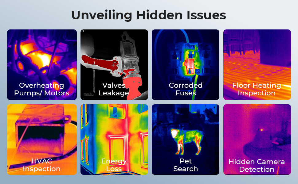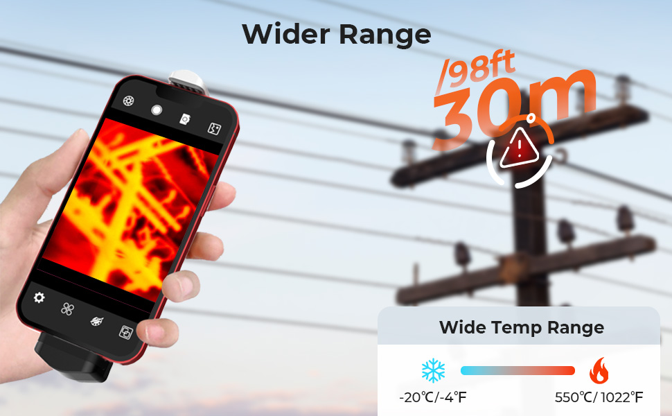 - * 30 m/98ft Wide Coverage & 56 °Store FOV;) Designet for rask inspisjon, vårt termal bildekamera for iOS og Android oppdager varmesignaturer innen 30 m/98 ft. Kombinert med et stort 56 °FOV hjelper deg å vurdere et bredt område eller objekter opptil 30 m/98ft i en enkelt skanning, raskt å se problemer i store rom, brede områder og områder som er potensielt farlig eller vanskelig å nå.