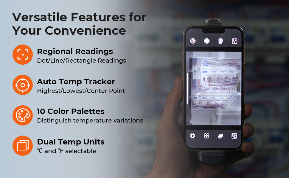 - * iOS og Android kompatibel, kraftig APP-kameraet vårt for mobilforbindelser wirelevant til smarttelefonen (Android og iOS), og du kan umiddelbart tilgi ulike personer som regionale temporalesninger (punkt, linje, rektangel), 10 fargepaletter og automatisk sporing av de varmeste og kaldeste punktene . Du kan også bruke innstillinger som emissivitet, temperaturenheter og mer.
