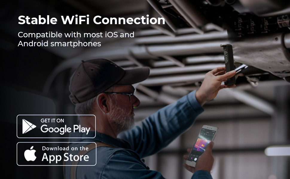 Den bygde i WiFi kobler vårt thermal bilde kamera til din smartphone (iPhone eller Android telefon, uansett merket). Du kan laste ned ekstrapakket appen vår på APP Store eller Google Play ved å lete etter W01 eller skanne QR-koden bak innretningen.