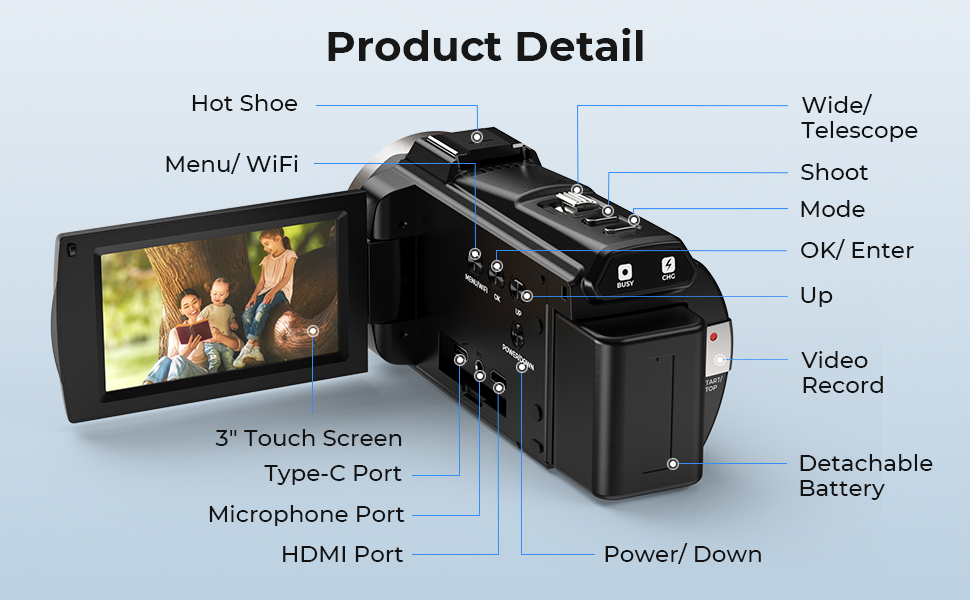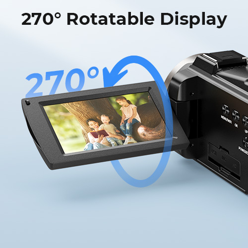 - * 270° Roterbar 3" Touchskjerm: Den 3" touchskjermen gjør den digitale videokameraen mer praktisk å bruke, du kan raskt se på bilder og justere innstillinger, noe som forbedrer skyteeffektiviteten. Den 270° roterbare designen lar deg enkelt justere skjermvinkelen for ulike filmingsoppgaver, perfekt for å ta selfies, vlogge og ta kreative bilder.