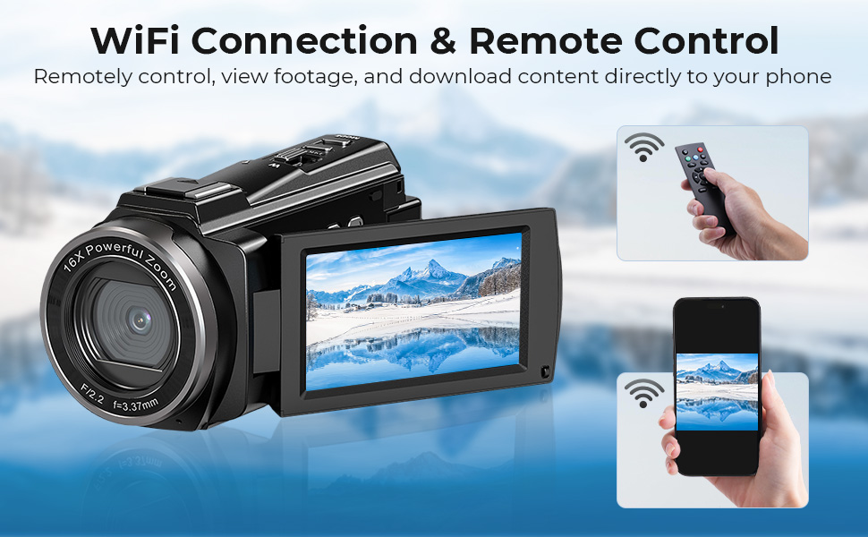 - * Wi-Fi-tilkobling & fjernkontroll: Ved å bruke "iSmart DV2"-appen kan du koble dette 5K-videokameraet til din Android/iOS-smarttelefon via Wi-Fi. Dette lar deg eksternt se, ta bilder/videoer og laste ned innhold direkte til telefonen. I tillegg lar den trådløse fjernkontrollen deg betjene vloggkameraet for å filme eksternt, noe som er praktisk for å ta selfier eller gruppebilder.