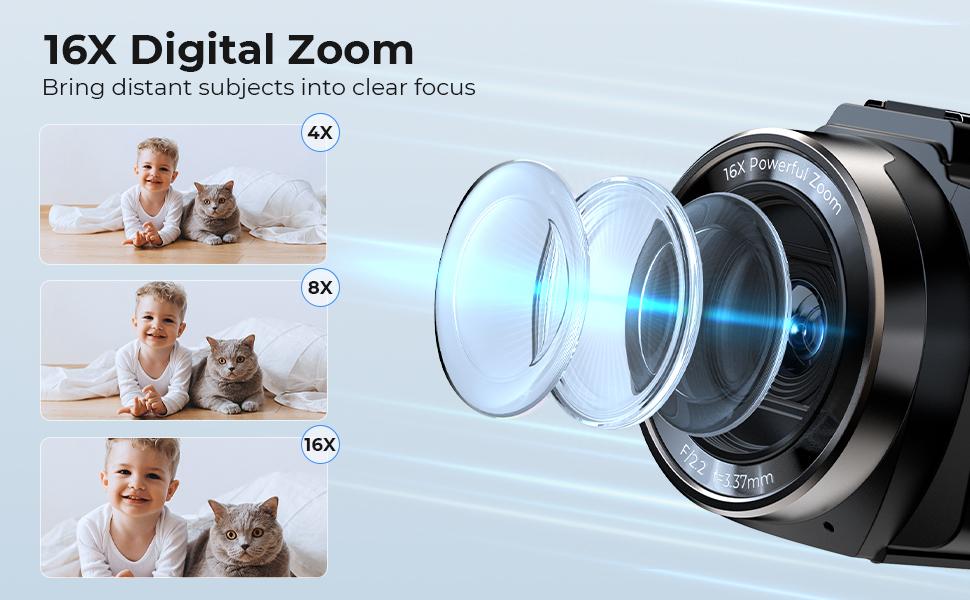 Utforsk videre og fang hver detalj med letthet. Med 16X digital zoom kan du enkelt bringe fjerne motiver nærmere, slik at fjerne scener blir krystallklare. Perfekt for å fange sportsbegivenheter, fjerntliggende arkitektur og landskap.