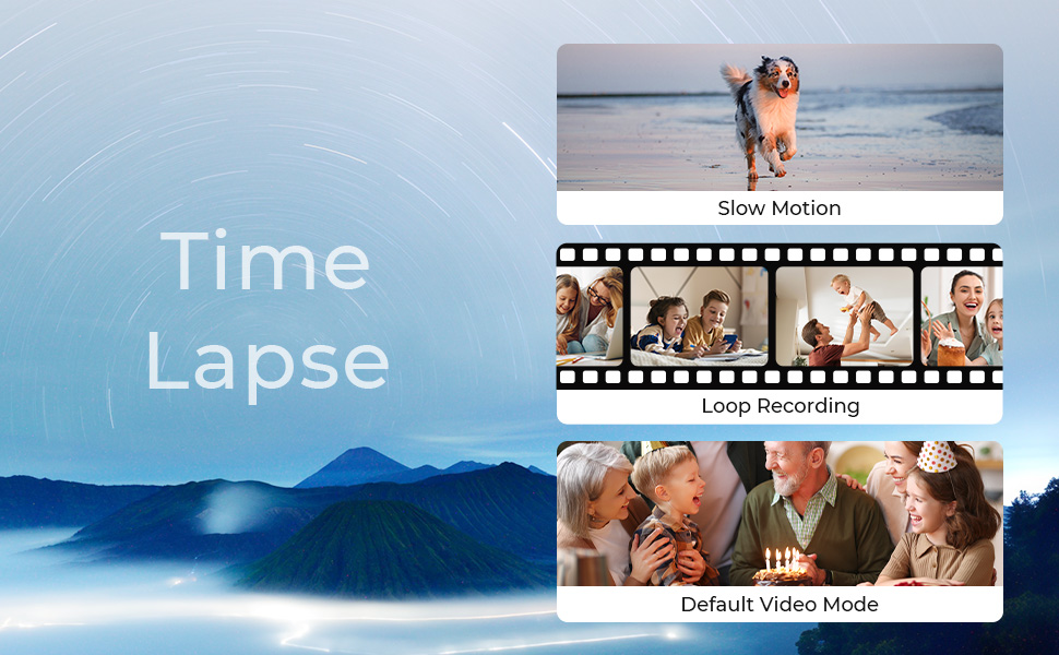 - • Time Lapse - Komprimer tid og se hendelser som planter som vokser eller skyer som beveger seg på bare noen få sekunder.