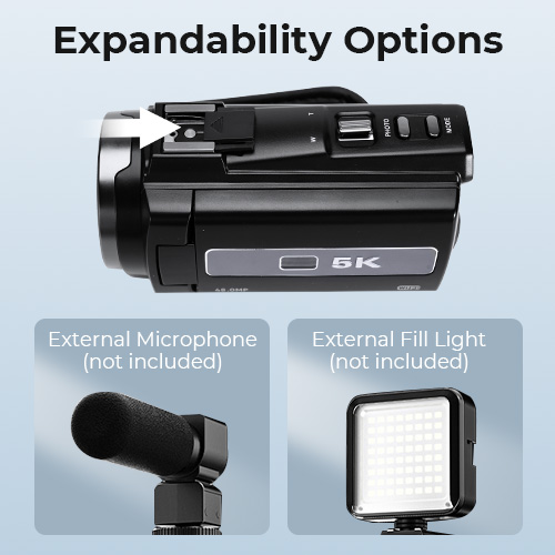 Denne videokameraen har en blitskinne, slik at du enkelt kan feste et eksternt fyllingslys (ikke inkludert) eller en ekstern mikrofon (ikke inkludert) for det ekstra profesjonelle touch. I tillegg lar 1/4" stativgjenge deg montere kameraet på et stativ, noe som gir deg friheten til å filme henderfritt og fokusere på å få det perfekte bildet.