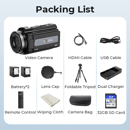 - * 12 deler tilbehør, gaveklar sett: Få hele skaperpakken: 5K videokamera, sammenleggbart aluminiumstativ, lensehette, kameraveske, HDMI-kabel, to batterier, dobbelt batterilader, 32GB SD-kort, fjernkontroll, ladekabel og renseduk. Det er den perfekte ferie- eller bursdagsgaven til foreldre, bloggere, innholdsskapere, studenter eller deg selv.