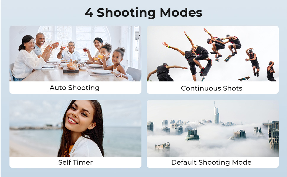 - • Automatisk bildeopptak – Tar automatisk bilder med jevne mellomrom. Passer for å fange gruppebilder på en familiesamling uten at du trenger å trykke på utløseren selv—bare still inn og nyt øyeblikket!
