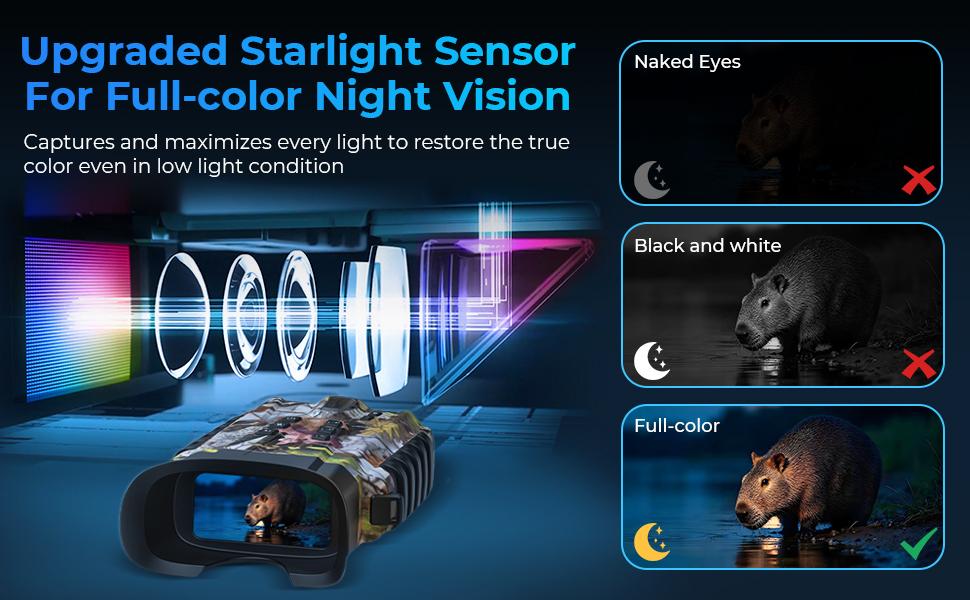 - * Full farge, dag og natt. I motsetning til andre irnattsyn-binokaller som bare viser svarte og hvite bilder om natten, bruker vår avanserte stjernelyssensor som fanger til og med det svakeste lyset, som leverer en vid, fullfarge synerfaring rundt klokka. Om det er dag eller natt, vil du nyte en idé om jakt, camping, nattfisk, båt, villmarke som ser på.