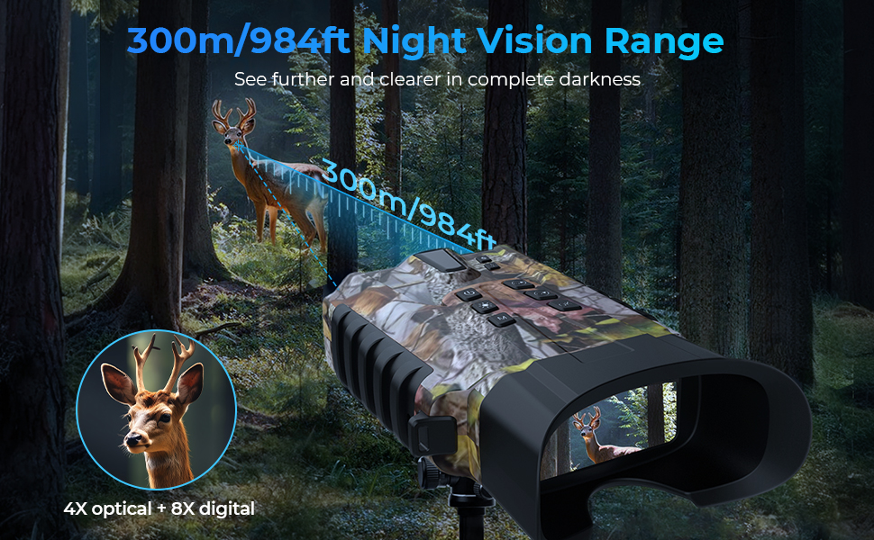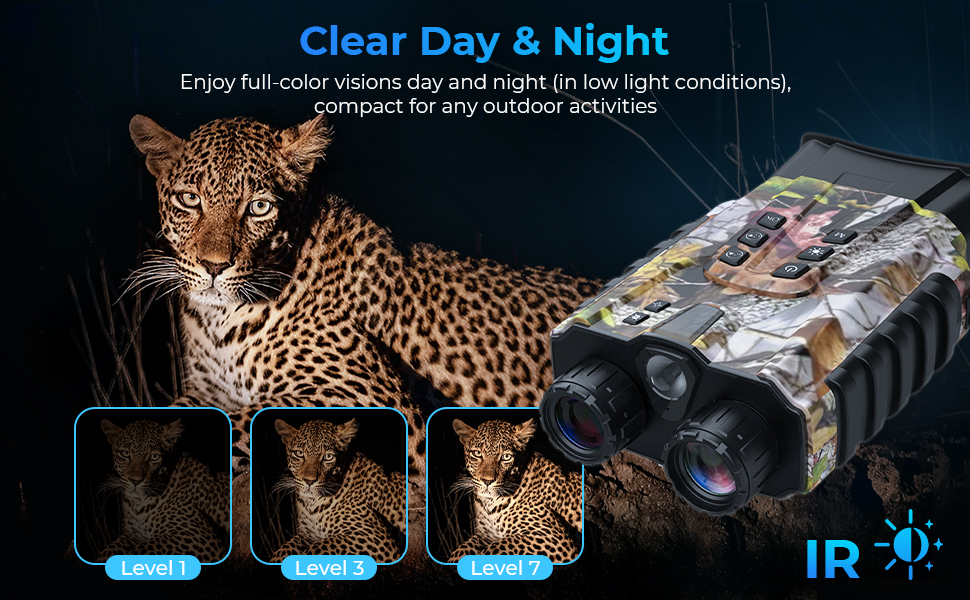 - * Lys og utvidet nattsyn. Med et mektig 3W 805 nm infrarert lys, mye infrarøde binokaller våre deg se målet opp til 300 meter (984 meter) borte. Pluss, 4X-optikken og 8X-digital zoom fører handlingen rett til øynene, ingen skritt nærmere! Opprett IR på 7-nivå for å kle både åpne og dekke områder som huler, lager, tete skoger, etc.