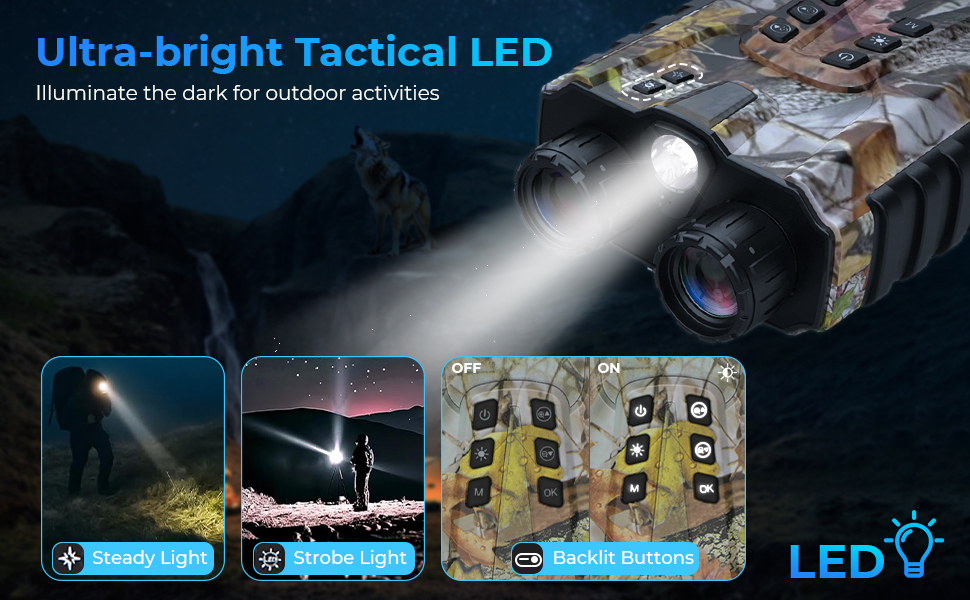 Våre infrarede binokaller for jakt kommer med et ekstra lys av LED, som tilbyr til moder: konstant lys og slaglys. I den strålen kutter lett gjennom mørket og gir klar lys for å utfordre utfordrende terreng eller sterke identifiserende objekter langt unna. mens lyset signaliserer ditt tilstedeværelse for å legge til oppmerksomhet og sikkerhet.