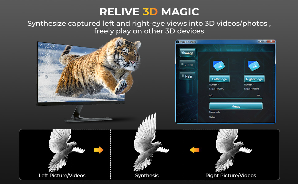 Du kan systhesisere de fanget videoene og bildene inn i 3D-innholdet ved bruk av den inkluderte appen, så se og dele dem på andre 3D-kompatible enheter.