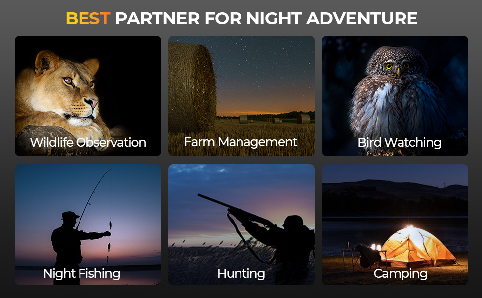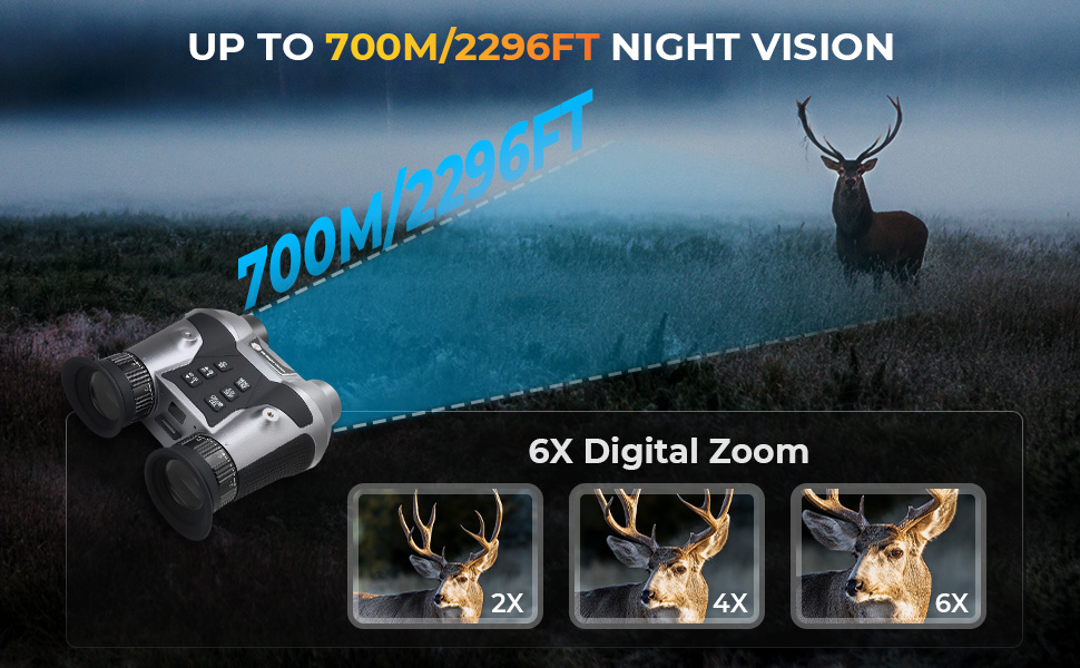 Med det mektige 850NM IR-lyset og avansert lins-system mye nattsynet vårt gå med infrarødt og la deg se opp til 2296FT (700M) i 100 % mørket, og du kan lett se en person unna 3281FT (1 KM) i lavt lys. Pluss, 6X-digital zoom lar deg ta med fjerne objekter nærmere, gjøre det perfekt for å se fjerne villmarker eller ta detaljerte bilder og videoer.