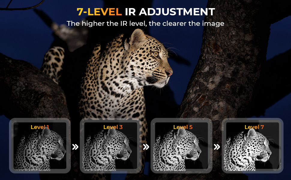 Opprett IR-intensiteten for å passe dine behov: øke det for en lysere, klarere utsikten i fullstendig mørke eller når du fokuserer på langt-borte mål. For nærmere forsøkspersoner eller når noe ambient lys er tilgjengelig, senk IR-nivået for å forhindre overeksponering og batterilivet.