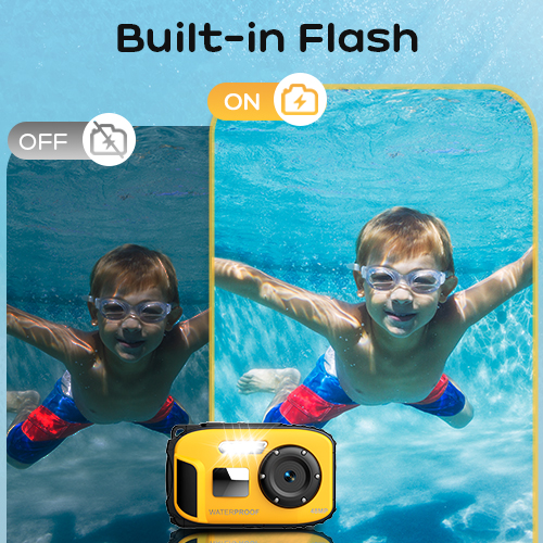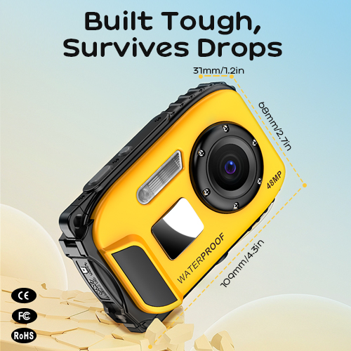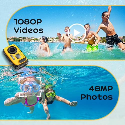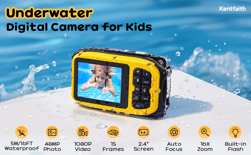 Bygget for nysgjerrige barn og undervanns moro! Denne tøffe, vanntette kameraet tar 48MP bilder og 1080P HD-videoer på dybder opptil 5m/16FT. Med 16X zoom, en 2,4" skjerm, autofokus og innebygd blits, sikrer den skarpe, lyse bilder – selv under vann. Med 15 leken rammer og 6 filtre kan barn tilpasse hvert bilde. Slitesterk, støtsikker og enkel å bruke – perfekt for stranddager, svømmebasseng, vannparker eller hverdagslige eventyr.