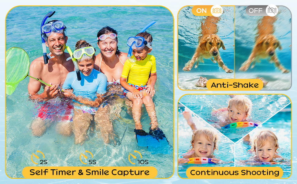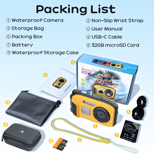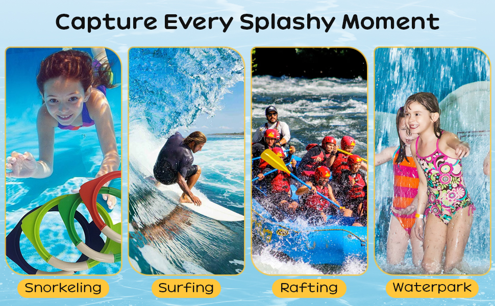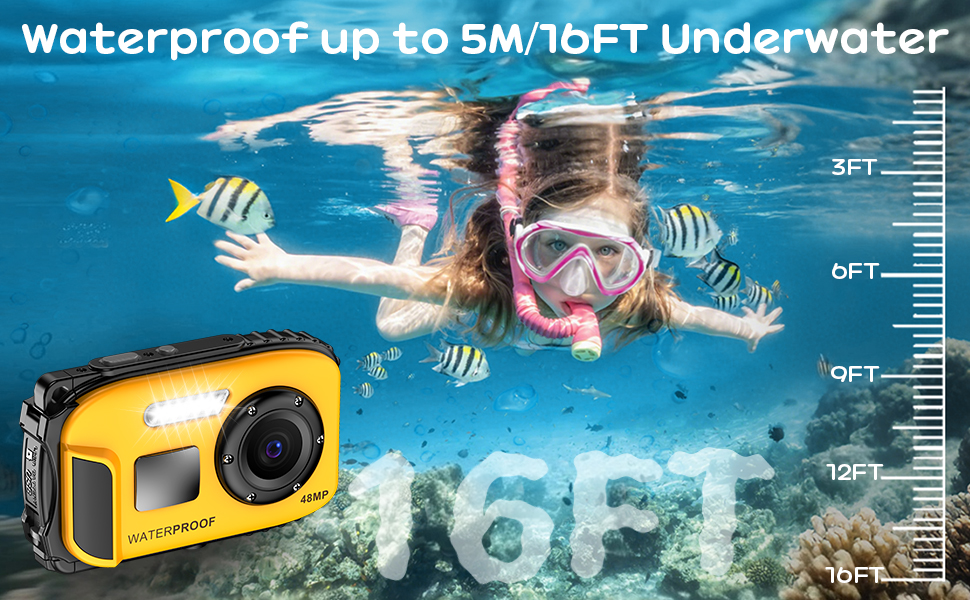- * 【Vannett opptil 16 fot – Designet for sprutende moro】Designet for unge oppdagelsesreisende! Denne IP68-sertifiserte undervannskameraet for barn lar barnet dykke opptil 16 fot (5 meter) – perfekt for svømming, strandferie, snorkling og badekarfester. Fang hver undervannsopplevelse uten bekymringer! Merk: Ikke glem å sette vanntett pluggen på plass før du går i vannet!
