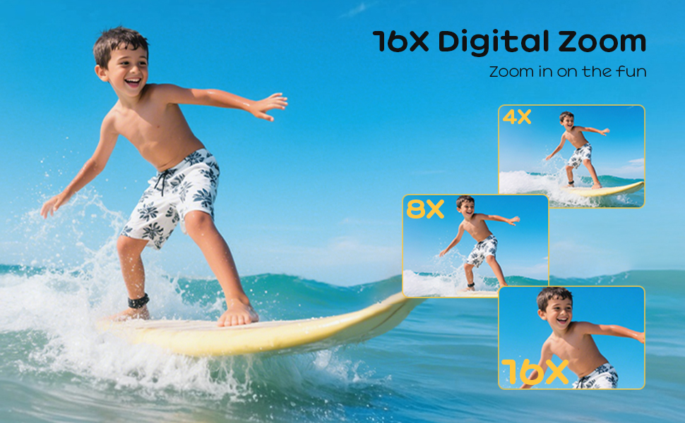 Med 16X digital zoom kan unge oppdagelsesreisende bringe fjerne undervannsunder nærmere uten å forlate sin trygge sone. Enten det er en sky fisk eller en fjern plask, vil de fange øyeblikket i skarpe detaljer mens de holder seg trygge.