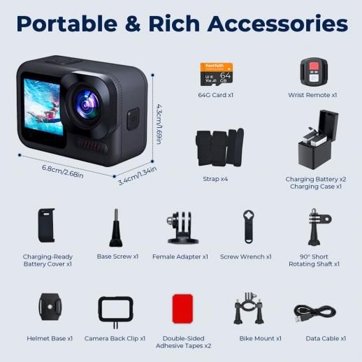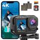 4K60FPS 48MP 66FT Vanntett Actionkamera uten etui, doble skjermer, 64GB-kort, EIS, WiFi-fjernkontroll, Kentfaith