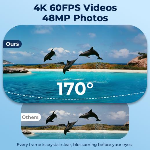 - Aksjonskameraet 4K har ultra HD 4K60fps videoopptak og 48MP bildeoppløsning. Du kan ta fantastiske videoer og bilder for å minnes eventyrene dine med skarp og klar kvalitet.