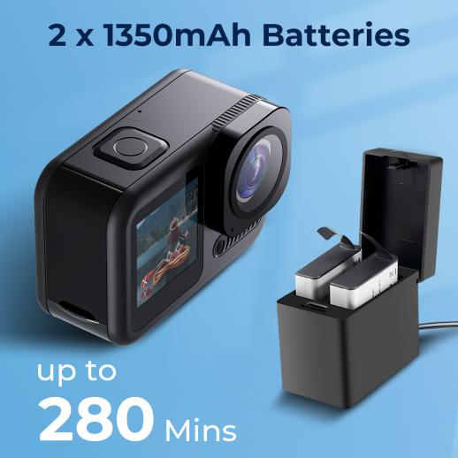 - * <b>Lang batterilevetid og praktisk fjernkontroll</b>: Leveres med 2 oppladbare 1350mAh-batterier som kan ta opp til 280 minutter, slik at du ikke trenger å bekymre deg for at strømmen går ut under hyggelige stunder med familie og venner. Denne actionvideokameraen kommer med en 2.4G fjernkontroll til håndleddet, som lar deg enkelt kontrollere kameraet, kjøre inn opptak og starte/stoppe videoopptak med enkelhet.