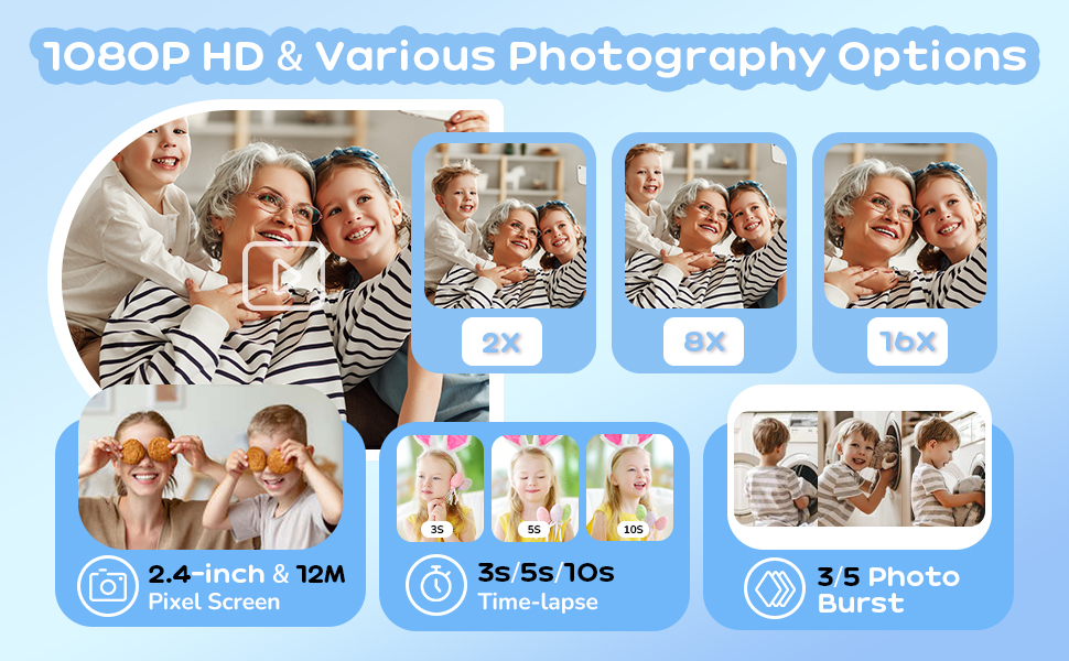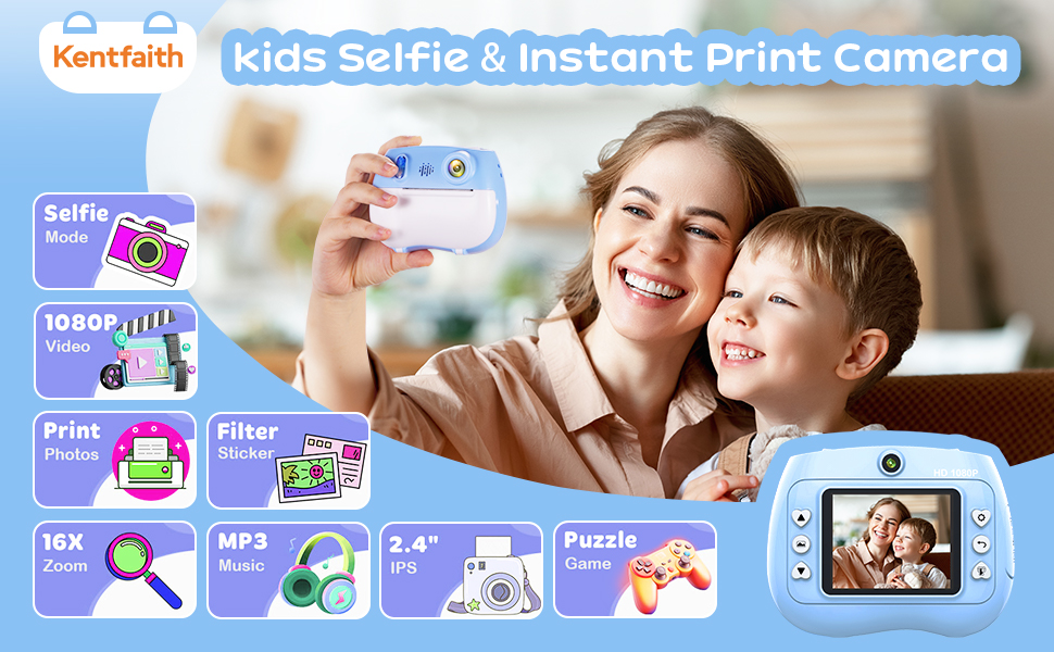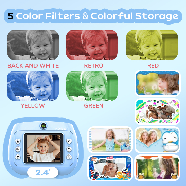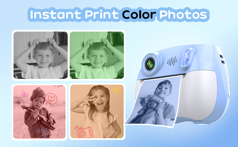 - * Multifunksjonelle unge Digital Camera;) Et lite øyeblikkelig trykkkamera for barn inneholder umiddelbart vibrant fargetrykk (rød/blå/grønt/Orange/svart/hvit) med frontselfiekamera, 2,4 tommer skjerm, 1080P-video, 16x digital Zoom, kreativ filterfram, MP3 og mer for å møte barns forskjellige behov.