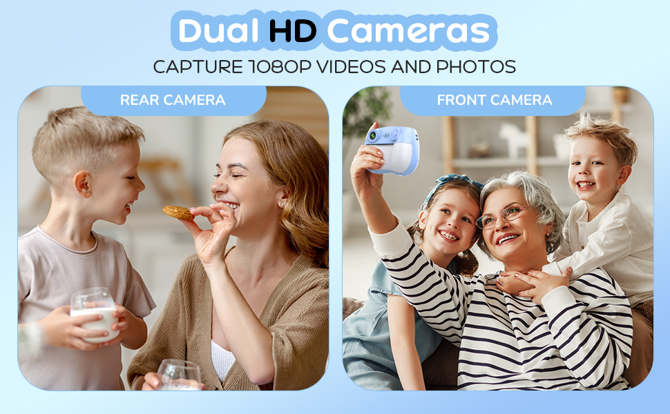 - Ikke la den størrelsen lure deg! Kameraet vårt pakker et slag med dobbelt 1080P kameraer, fanger fantastiske bilder og videoer. Flott for å ta selfier og hva de vil rekord. Spesielt designet for barn, det er lett å bruke, peke og trykke, og et perfekt bilde er laget og lagret. Den kompakte størrelsen gjør den perfekt passende for små hender.