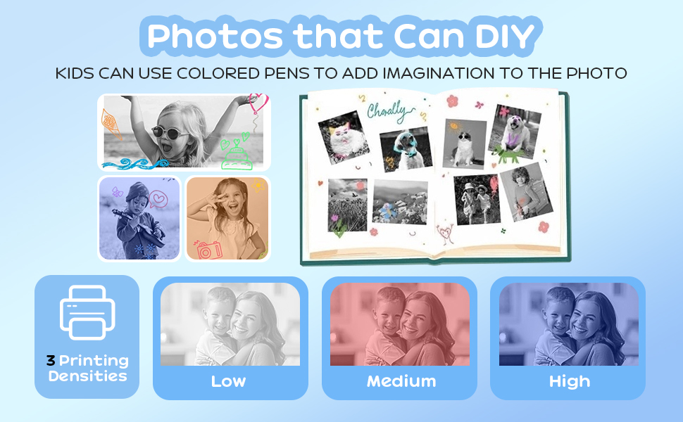 - ㆍ3 Unger som umiddelbart trykker kameraet bruker avansert teknologi, termal trykking og umiddelbart trykking. Avtrykk intensitet lett med 3 moder (lav/medium/høy) etter bilde. Den har også dotttrykk og grå avtrykk, de kan velge måten de liker å sette.