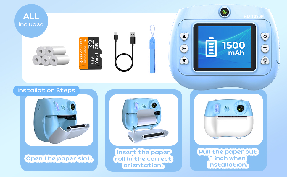 - ㆍ Økonomisk: Barnets kamera med et 32GB mikroSD-kort og 5 papir, som kan spare 2500+ bilder og trykke 250+ bilder. [Max 128GB]