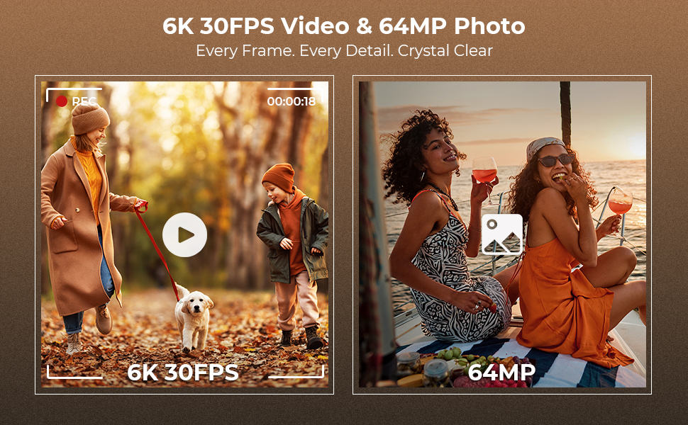 - * Profesjonell 6K-bildekvalitet i dine hender: Fang livet med imponerende klarhet i ekte 6K/30FPS-video eller ultrajevn 4K/60FPS. Ta 64MP høyoppløselige stillbilder og dra fjerne scener nærmere med 18X digital zoom—hver detalj forblir skarp, noe som gjør videokameraet perfekt for vlogging, reiser og å bevare hverdagsminner i kinematografisk kvalitet.