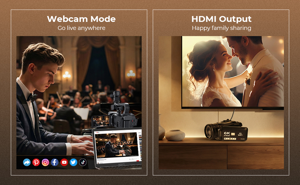 - * Webkammodus, HDMI-utgang, Klar profesjonell lyd: Gjør din 6K videokamera til en plug-and-play-webkamera for strømming eller videosamtaler. Send opptakene direkte til TV-en din via HDMI for skarpt, storskjermdeling. Den medfølgende trådløse mikrofonen fanger klar, vindredusert lyd—perfekt for vlogger, intervjuer og live kommentarer.