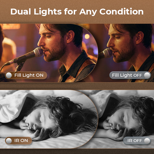 Overkom enhver belysningsutfordring med doble innebygde systemer. LED-fyllingslysene lyser opp portretter og mørke scener. Aktiver IR-lyset for usynlig belysning, som gir skarpt svart-hvitt opptak i fullstendig mørke.
