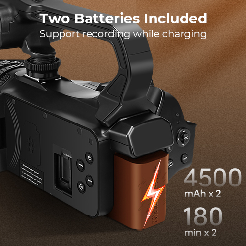 Kentfaith 6K videokamera inkluderer to 4500mAh oppladbare batterier, som gir opptil 3 timers opptak per batteri (opptil 6 timer totalt). Den støtter også opptak mens den lades via USB-C.