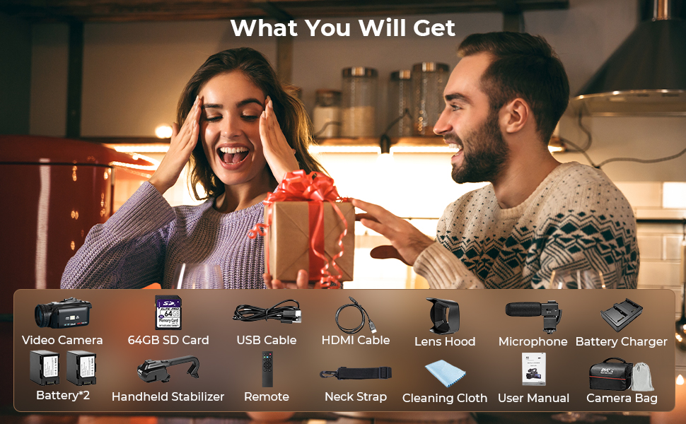 - * Klar-til-å-filme Komplett Sett: Få alt du trenger i én boks: 6K videokamera, to 4500mAh-batterier for utvidet filming (ett ekstra), et 64GB SD-kort, trådløs mikrofon, stabilisator, linseskjerm, fjernkontroll, HDMI- og USB-C-kabler, dobbelt lader, halsreim og en robust oppbevaringsveske. Begynn å lage innen minutter – ingen ekstra kjøp nødvendig.