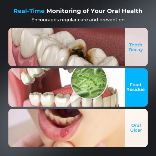 Interaoralt kamera er utstyrt med et 1080P HD-kamera med 2MP-oppløsning sørger for at hver detalj av oralen din er krystallklart. Enkelt lokalitet, små crack, tyggeproblemer eller skjulte plakater, som kan gjøre noe før det blir alvorlig.