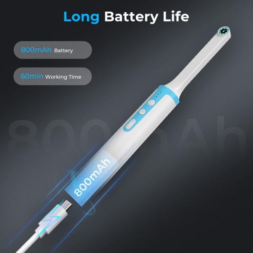 Med et 800 mAh rekrurbar batteri gir dette trådløse intraorale kameraet deg opp til 60 minutter av bruk - perfekt for flere tennesjekker uten behov for å trekke deg tilbake.