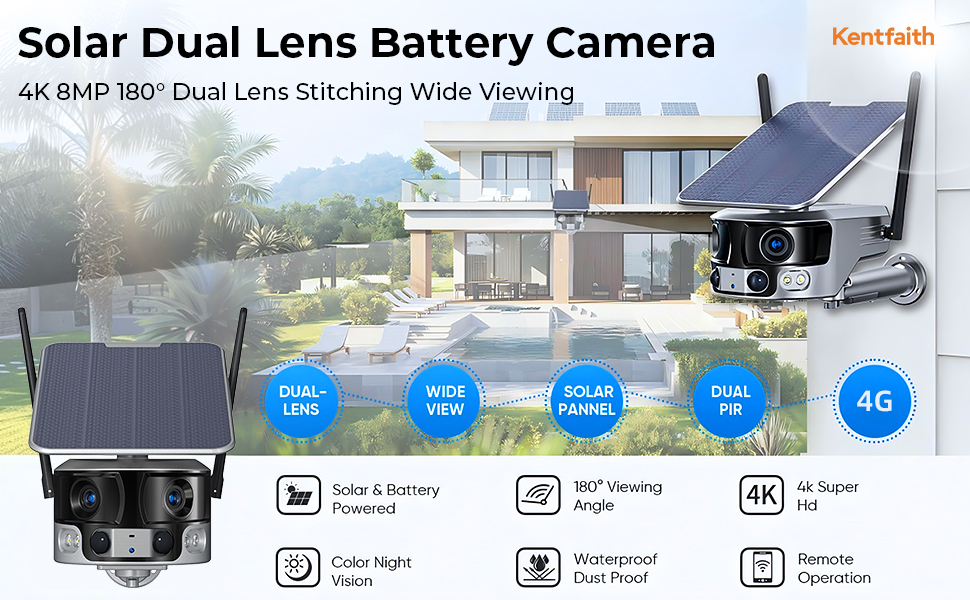 4G-sikkerhetskamera med 4K-klarhet, 180° panoramautsikt med dobbelt linse, solcelledrevet, 360° livevisning, farge nattsyn, 2 pakker, Kentfaith