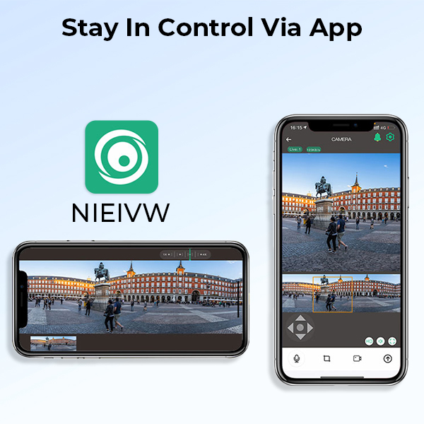 Bryt fri fra begrensningene til tradisjonelle 110°-kameraer. Vår innovative 4G-sikkerhetskamera kombinerer sømløst bildene fra to linser til ett imponerende, 180° ultravidt bilde, slik at du får et fullstendig overblikk over eiendommen din i ett enkelt bilde. Trenger du mer kontroll? Bruk 355° panoreringsfunksjonen og 90° tilt-funksjonen direkte fra telefonen din for å zoome inn på viktige områder. Perfekt for gårder, parkeringsplasser, travle gater og store bakgårder.