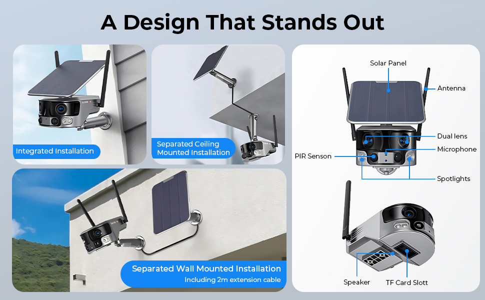- Total dekning, total frihet! Få en 4K krystallklar, 180° panoramautsikt av eiendommen din med vår cellulære sikkerhetskamera (ikke flere bytter mellom forskjellige linser). Fra gårder til byggeplasser, få enestående sikkerhet, selv der WiFi ikke når.