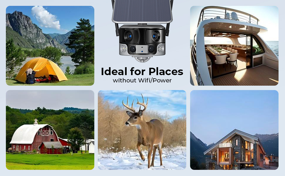 - Vår 4G utendørssikkerhetskamera kjører på solenergi og 4G LTE, og gir pålitelig overvåking selv i de mest avsidesliggende områdene. Ideell for gårder, låver, kaier, byggeplasser, fritidsboliger, bobil og andre steder uten tilkobling til strømnettet.