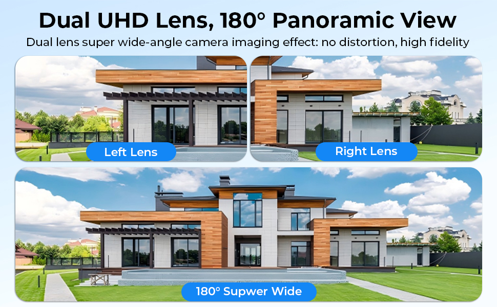 - * Revolusjonær 180° utsikt & 360° dekning: Denne innovative overvåkingskameraet har doble linser som intilligent flettes sammen for en sømløs 180° ultra-bred utsikt. Se hele eiendommen din, fra gjerde til gjerde, i ett enkelt bilde. Med 355° panorerings- og 90° tilt-funksjoner sikrer den at ingenting går upåaktet hen. Perfekt for gårdsmonitorering, bedriftsovervåkning, bolighager, garasjer og byggeplasser.