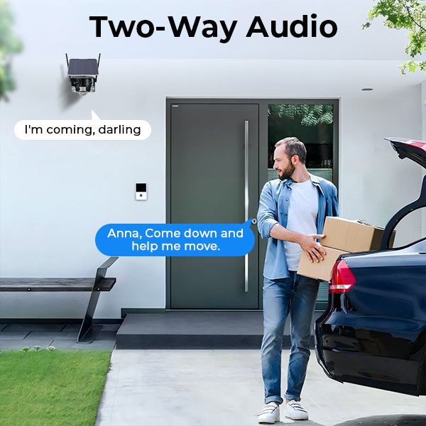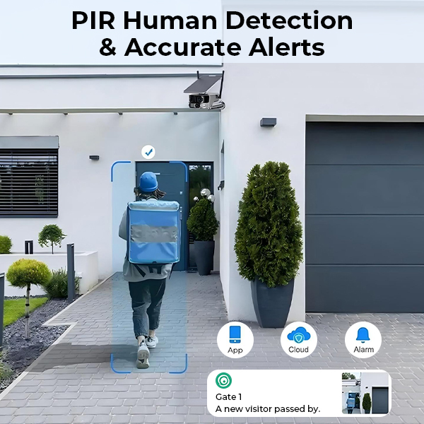 - * Smart bevegelsesdeteksjon og varsler i sanntid: Denne 4G-sikkerhetskameraen har en avansert PIR-sensor og AI-menneskedeteksjon. Når en ekte trussel oppdages, utløser den automatisk et kraftig spotlight og en kraftig sirene for å skremme inntrengere. Du vil motta en umiddelbar varsling eller telefonsamtale, slik at du kan se direktestrømmen og bruke toveis lyd for å snakke direkte med den som er på eiendommen din.