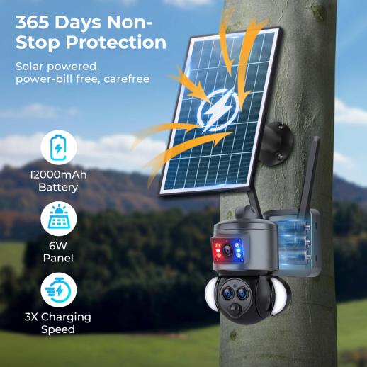 - * 【Solardrevet, helårs beskyttelse】Glem trådrot og strømregninger. Drevet av et 6W høyeffektivt solcellepanel og et 12000mAh oppladbart batteri, kjører dette trådløse overvåkingskameraet 24/7. Bygget robust med IP65 vanntetting og temperaturmotstand fra -4°F til 140°F (-20°C til 60°C), er det laget for å tåle regn, snø og varme, perfekt for helårs utendørs bruk.