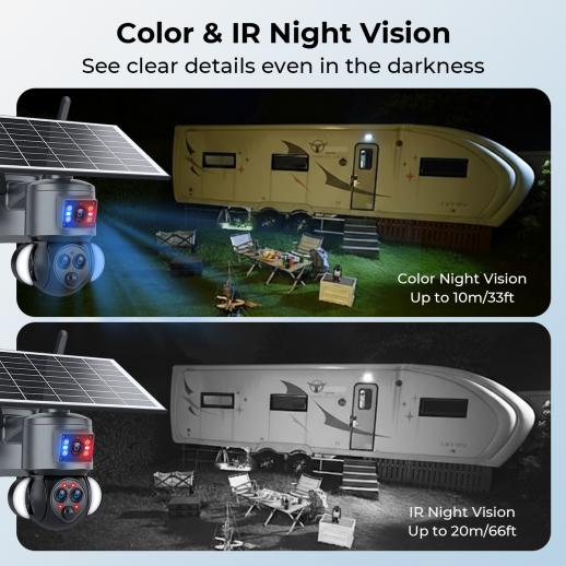 Utstyrt med seks dobbelt-chip LED-er (hvitt + rødt) og to flomlys, leverer Kentfaith mobilovervåkingskameraet lyse fargebilder om natten opptil 10 m / 33 fot og infrarød klarhet opptil 20 m / 66 fot. Fra bunnmørke netter til svakt opplyste gater, forblir hvert bilde lyst, balansert og fullt av detaljer.