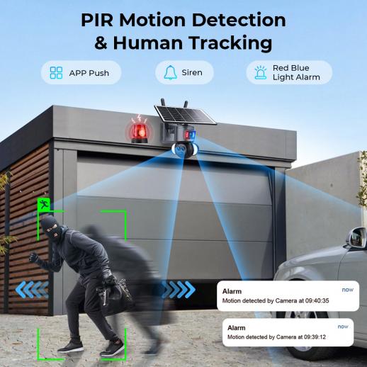 Utstyrt med avansert AI-menneskedeteksjon og en PIR-bevegelsessensor, skiller Kentfaith trådløs overvåkingskamera mennesker fra kjæledyr eller forbipasserende biler, slik at du bare får varsler som betyr noe. I det øyeblikket noen kommer inn i bildet, låser den på, sporer bevegelse og begynner å ta opp på bare 0,2 sekunder, samtidig som den sender sanntidsvarsler til appen. Hvis fare nærmer seg, aktiveres de rød-blå advarselslysene og den innebygde sirenen automatisk for å avskrekke inntrengere. Den overvåker ikke bare – den vokter hjemmet døgnet rundt.