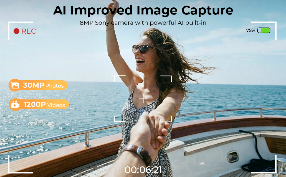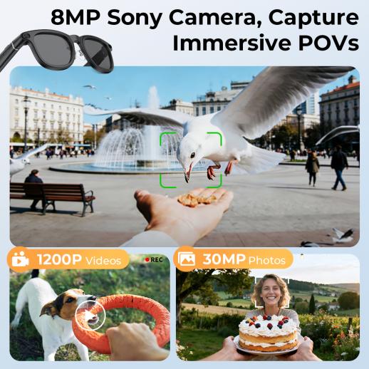 • * 8MP Sony-kamera, oppslukende POV-er: Med en 8MP Sony-kamera kan du ta opp jevne, stabiliserte 1200p-videoer eller ta et strålende 30MP-bilde med et trykk eller en enkel stemmekommando. AI-forbedret visuell kvalitet gjør hvert minne levende. Fordi de ser ut som vanlige briller, kan du ta opp diskret, noe som gjør dem perfekte for å fange ekte øyeblikk under reisene eller daglige eventyr.