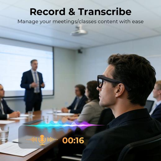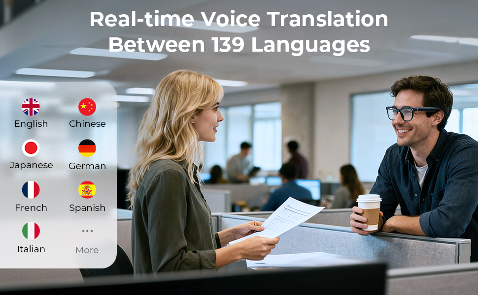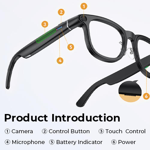 • * AI-drevet intelligens: Spill inn, oversett og gjenkjenn: Smartere enn noensinne gjør disse smartbrillene med kamera mer enn bare å fange bilder. Ta opp lyd under møter med et enkelt trykk, få sanntids lydoversettelse i 134 språk med undertekster på skjermen, og identifiser objekter eller scener ved hjelp av innebygd AI-gjenkjennelse. Det er ditt ultimate verktøy for reise, arbeid og nysgjerrighet.