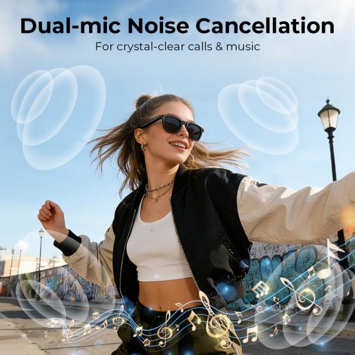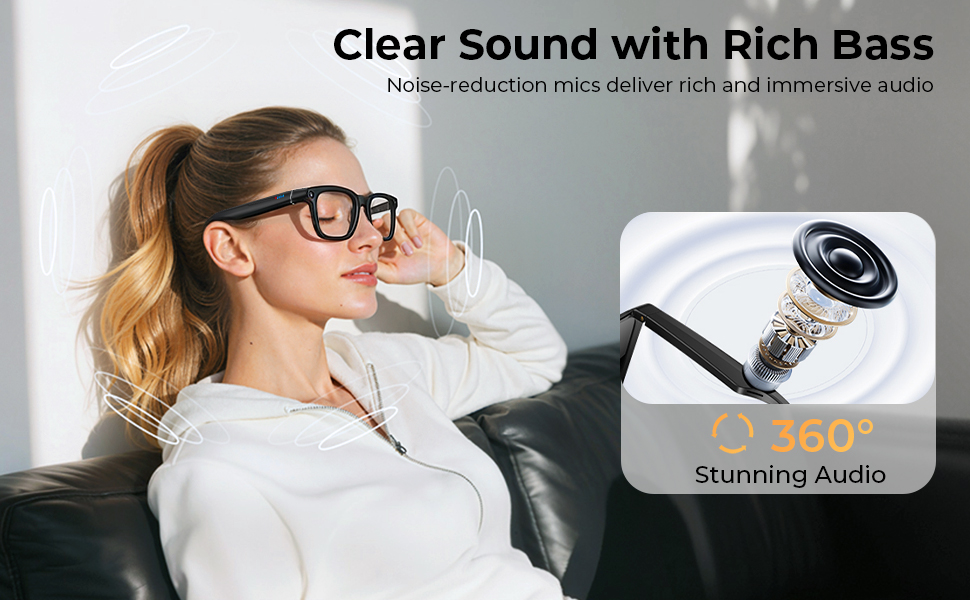 • Gi ørene dine en pause – ingen hodetelefoner nødvendig! Våre kamerabriller har doble støydempende mikrofoner og høyttalere, som fjerner bakgrunnsstøy og leverer krystallklar lyd. Koble til via Bluetooth for å ta imot anrop henderfritt mens du sykler eller kjører, eller nyt favorittmusikken din selv på en travel gate – enkelt, tydelig og helt henderfritt.