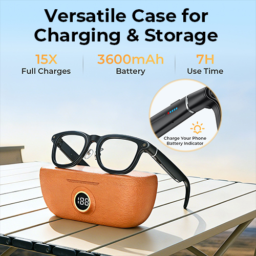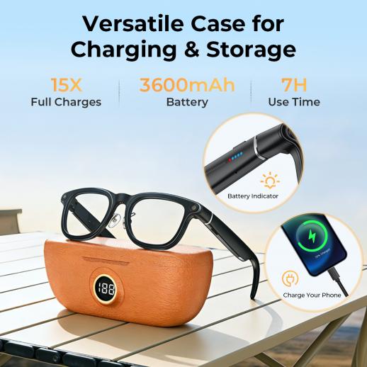• * Pålitelig batterilevetid med ladeetui: Fulladede briller kan vare opptil 6 timer for musikk og 50 minutter for kontinuerlig videoopptak. De 3 indikatorene på tinningene viser deg den gjeldende batteristatusen. Dessuten gir ladeetuiet med et 3600mAh-batteri ytterligere 15 ladninger for kamerabrillene, og fungerer som en strømbank for å lade telefonen din når du trenger det mest.