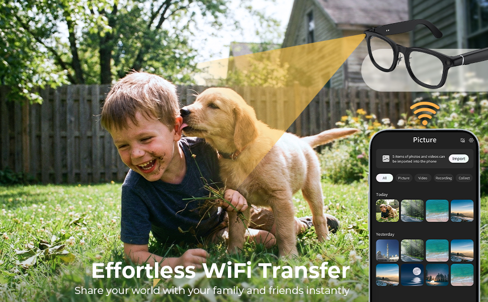 • Fang verden akkurat slik du ser den. Med våre smarte brillekameraer føles hvert øyeblikk mer oppslukende fordi det er spilt inn fra ditt sanne synspunkt. Når noe spesielt skjer, er det ikke nødvendig å ta frem telefonen – bare trykk på en knapp for å fange krystallklar, stabil 1200P-video og fantastiske 30MP-bilder, akkurat i øyeblikket.