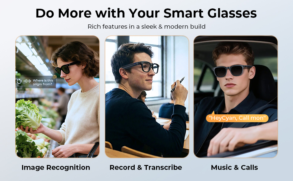 • Har du noen gang følt en gnist av nysgjerrighet og ønsket å få svar umiddelbart? Bare se på noe og spør: «Hei, Cyan, hva er det?» Drevet av innebygd AI med ChatGPT, identifiserer våre kamerabrilleglass det du ser og gir svar på stedet. Fra bygninger og planter til dyr og hverdagslige gjenstander, blir nysgjerrigheten tilfredsstilt i samme øyeblikk.